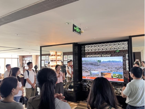 12日下午,移动课堂首站来到海口观澜湖度假酒店。何彪教授要求同学们 “眼勤”、“脑勤”、“腿勤”,用心观察、用心思考、勤于实践。在酒店经理张晶的引导下,同学们前往天际线展示厅、客房、高尔夫球场等地实地体验,领略高端旅游综合体的魅力,了解酒店运营模式。