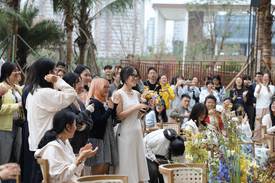 本次实践活动由吴珏副教授担任课程指导。员工团队围绕主题,从整体创意策划、流程设计到舞美布置、礼服搭配、现场执行与传播组织,完整演练婚礼项目的全流程。20日清晨,搭建组同学便与工作人员一道完成场地布置;下午,参与师生陆续抵达,通过拍照打卡、互动绘画与轻松社交等环节,沉浸式感受婚礼文化,期待16:30正式仪式的开启。伴随《A Thousand Years》的旋律,新人缓步入场,仪式在温馨而庄重的氛围中展开。交换戒指与共诵誓言环节,呈现了从课堂同伴到携手同行的成长故事,让在场师生切实体会到婚礼仪式背后的情感表达与专业设计。