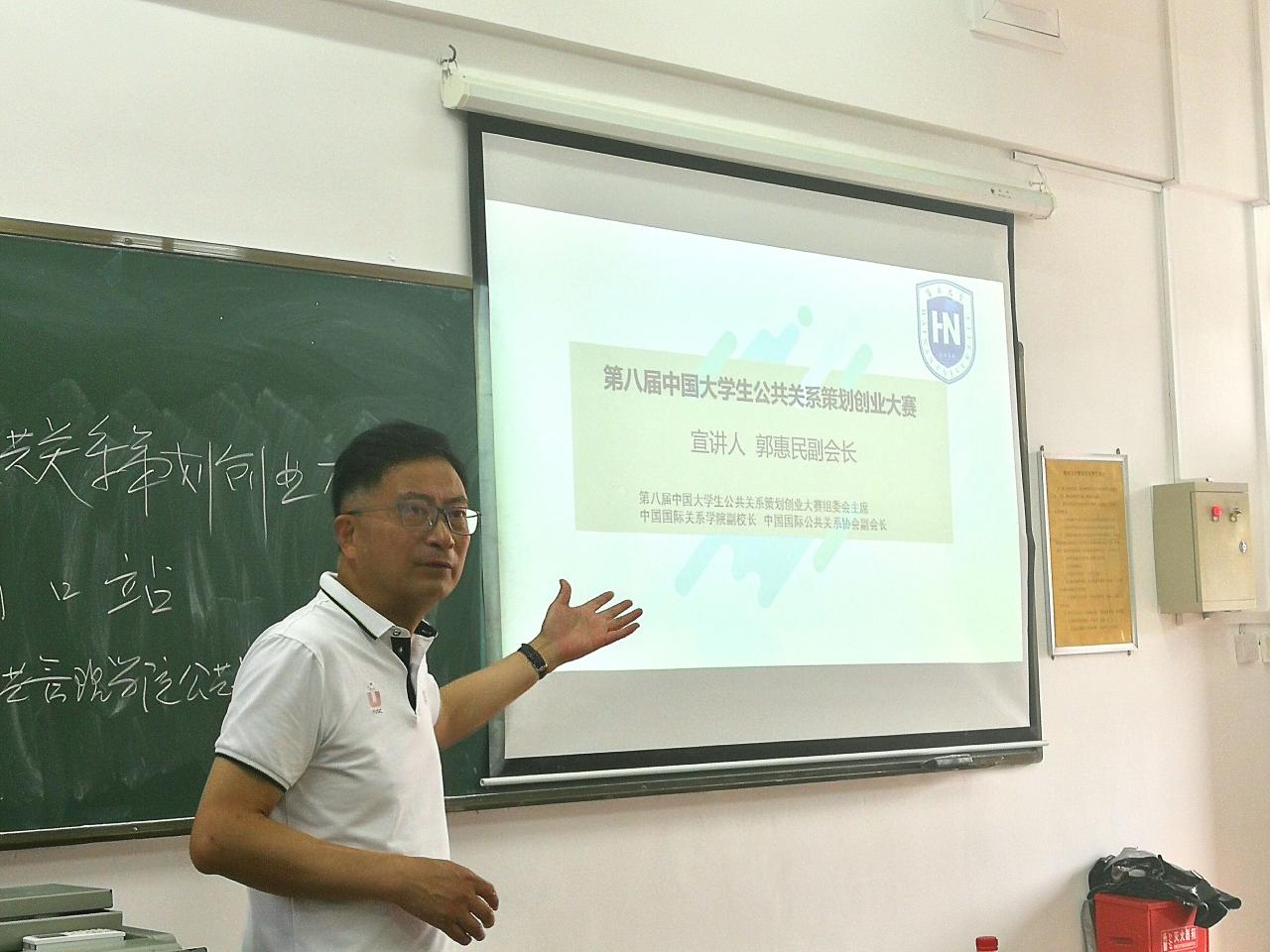 2021年5月25日上午10:00,第八届中国老员工公共关系策划创业大赛巡讲会(海口站)在公司海甸校区2-302举行。中国国际关系协会副会长、第八届中国老员工公共关系策划创业大赛组委会主任郭惠民教授为本次巡讲会的主讲人。