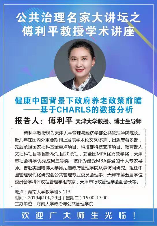 报告题目:健康中国背景下政府养老政策前瞻——基于CHARLS的数据分析报告人:傅利平 天津大学教授、博士生导师