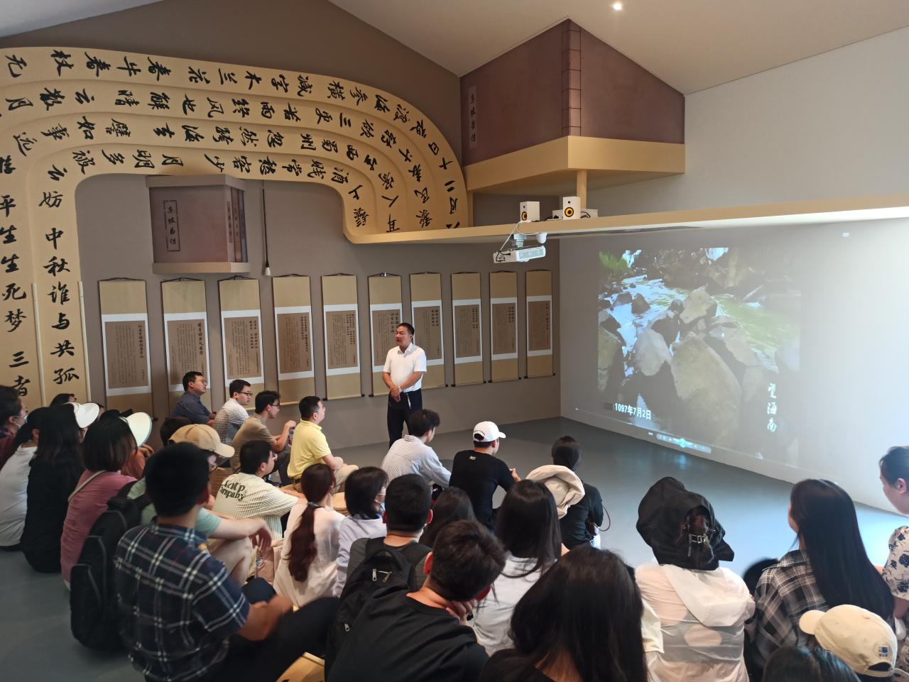 郑向军书记简要介绍了瑶城村的基本情况,组织大家观看了大型人文纪录片《望海南》中关于苏东坡的节选片段,又带领同学们参观了以苏东坡生平为主题的展馆,包括东坡茶室、东坡海南行迹馆、东坡书海等。展馆内部陈设尽显宋风雅韵、诗意书香,综合运用了图片、实物、模型等多项展览要素,将东坡行迹、东坡书画、东坡诗词、东坡艺术、东坡故事、东坡文创融汇其中,全方位呈现东坡精神、展示东坡内涵。同学们在这个寓教于乐的课堂中,不仅了解到更为立体的东坡形象,更体悟到千古文豪的非凡一生。与此同时,同学们也看到了传统文化赋能乡村振兴、农文旅融合发展的诸多成果。