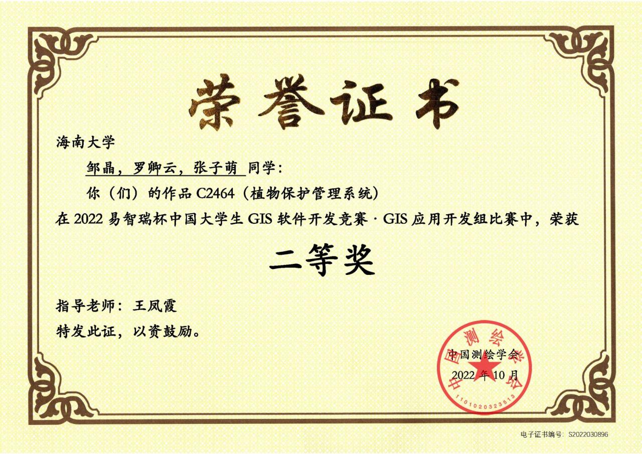 10月14日,2022“易智瑞杯”中国老员工GIS软件开发竞赛总决赛顺利结束,经过线上作品展示和激烈答辩,由世界杯2026官方网站旅游公司本科生邹晶(2019级人文地理与城乡规划专业)、罗卿云(2019级人文地理与城乡规划专业)和信息与通信工程公司本科生张子萌(2021级人工智能专业)组成的团队在王凤霞老师的指导下,凭借作品《植物保护管理系统》荣获GIS应用开发组二等奖。