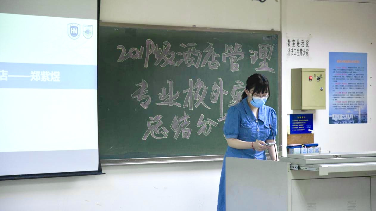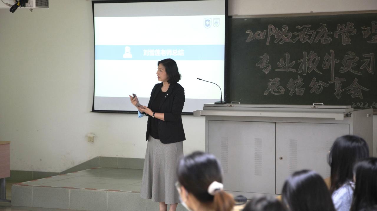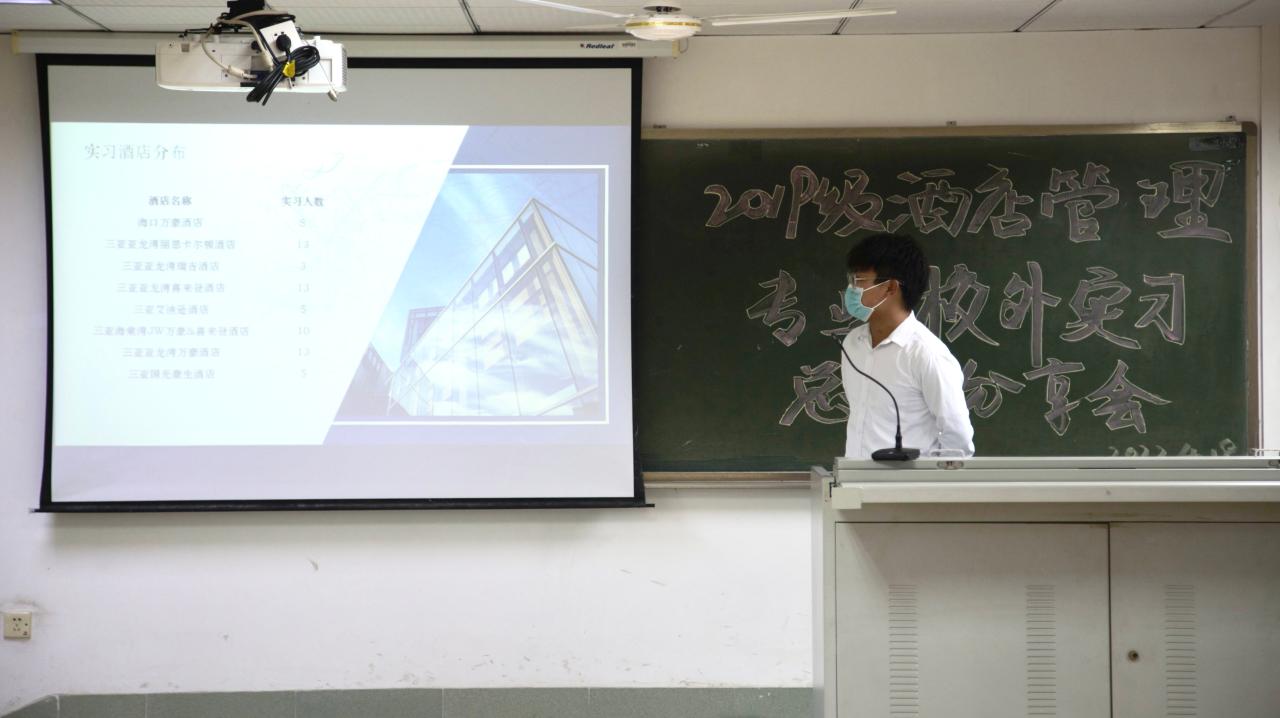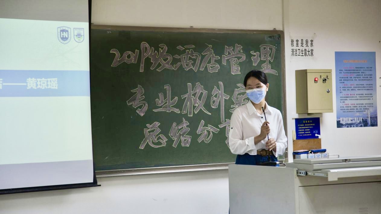老师总结结束后,由马晋圆同学对此次2019级酒店管理专业的实习情况进行汇报。马晋圆同学依托前期问卷调查数据,从同学们对本次实习的满意度、对实习酒店管理水平的反馈、实习期间心理状态、未来的职业规划等多个方面进行了详细的分析和汇报,并总结传达了同学们对本次专业实习的意见和建议。通过本次实习,同学们都发现了自己的不足和理论联系实际的欠缺,未来会继续深入学习,确立自己的职业规划目标,在今后的实习生活中不断提升自我,达到新的高度。