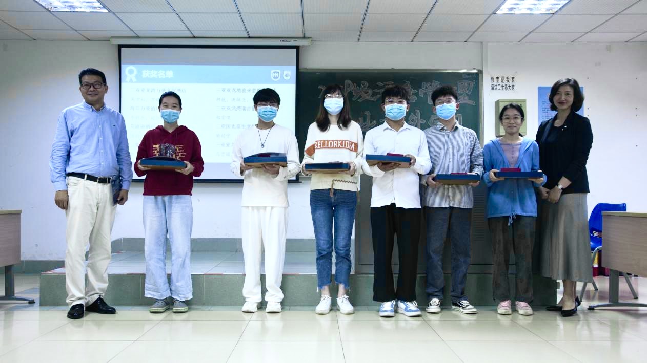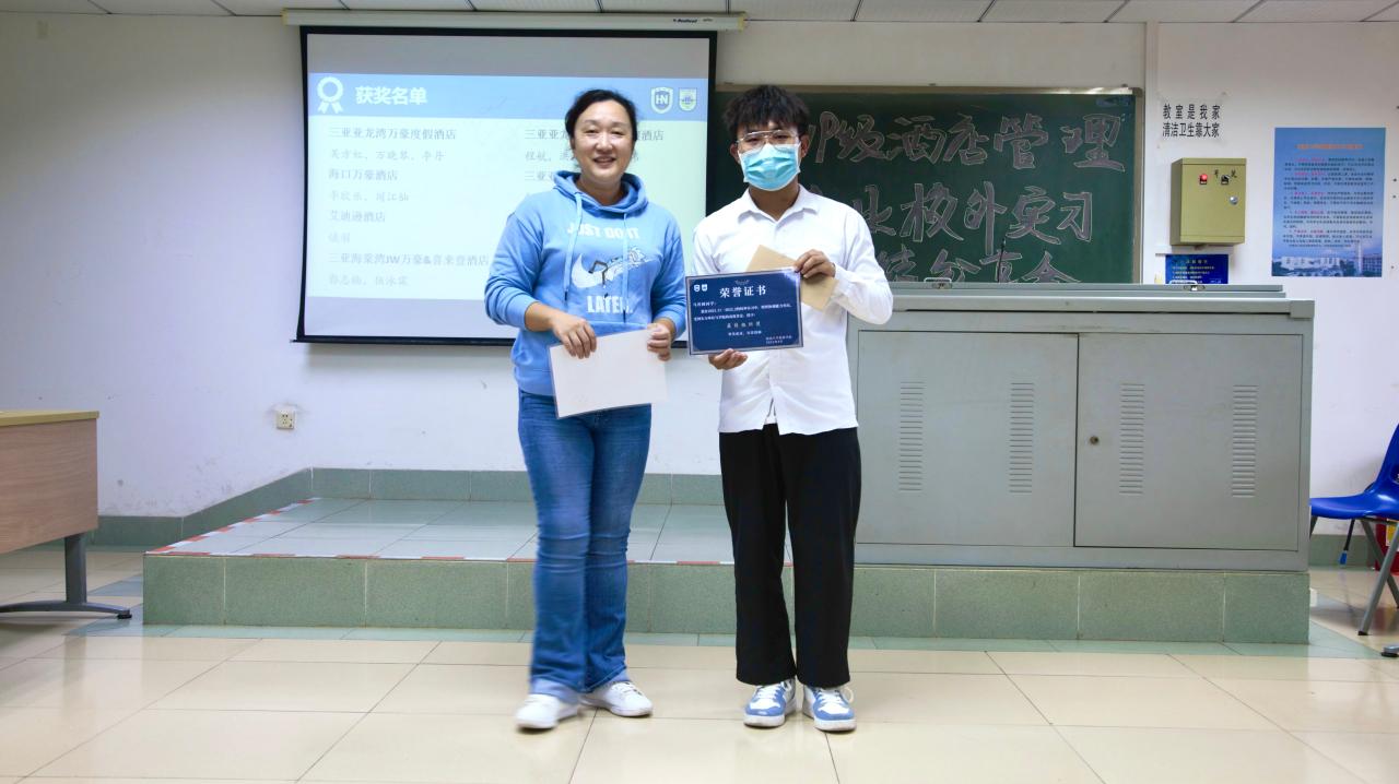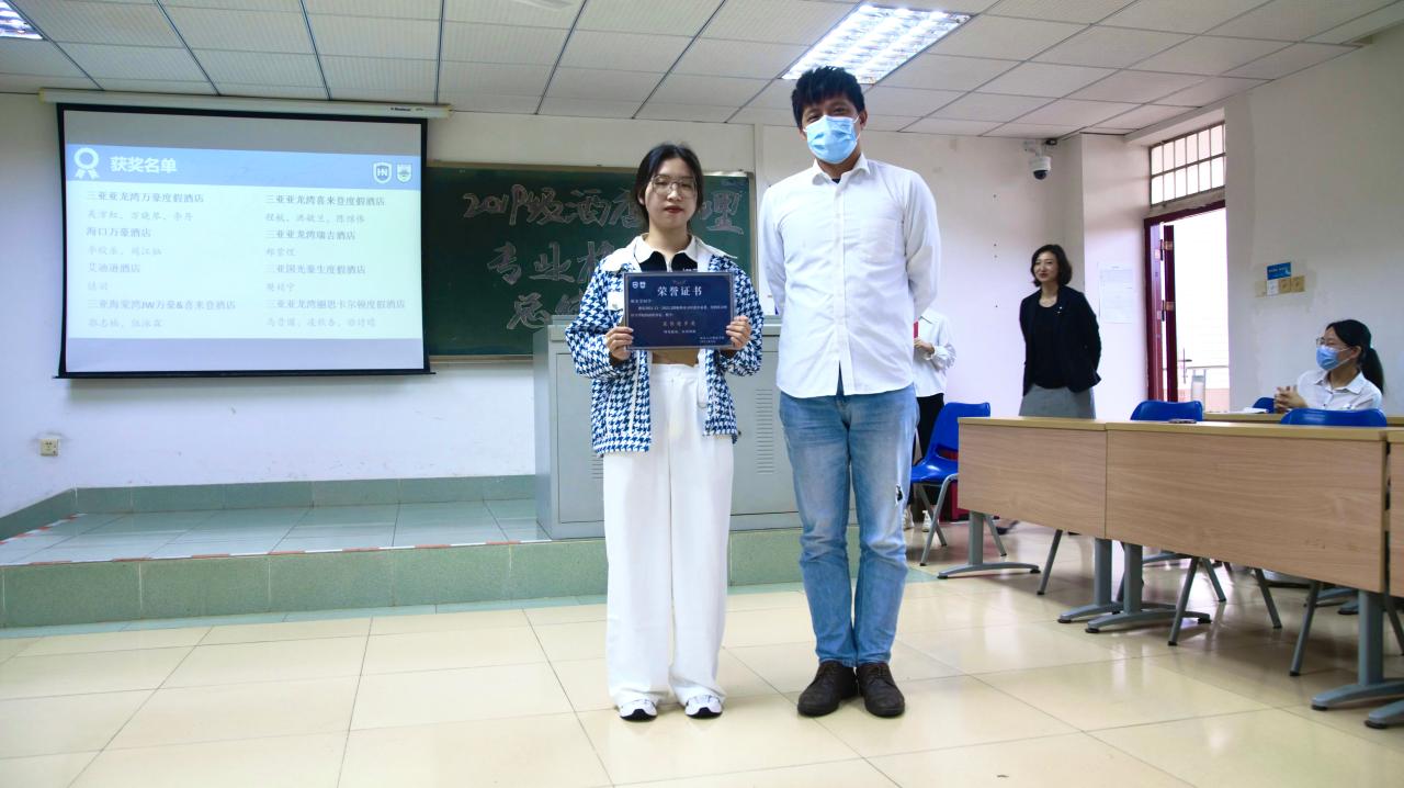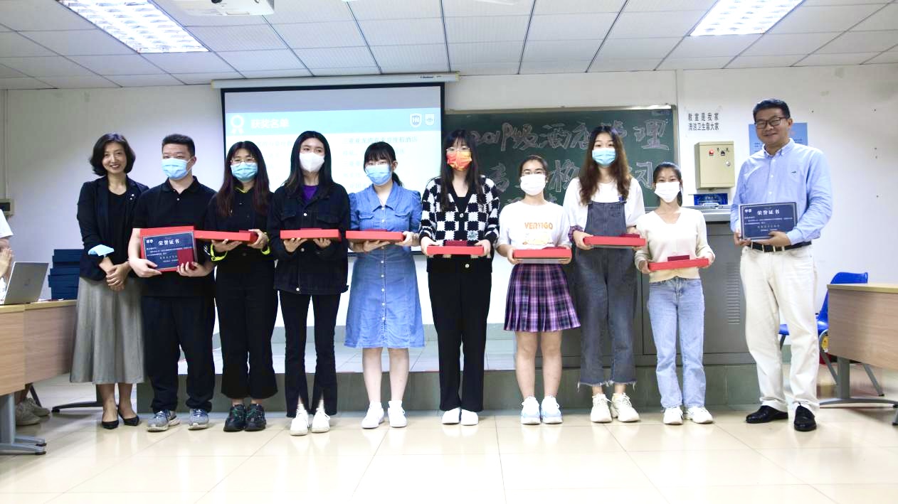 在本次校外专业实习中,涌现出了一批优秀的实习生,他们的表现受到了酒店及公司的高度认可。谢祥项、刘雪莲等四位老师为马晋圆、胡美莹等同学颁发了优秀实习生、最佳组织奖以及最佳进步奖。其中最佳组织奖以及最佳进步奖奖品由华彩华邑酒店特别赞助,华彩华邑酒店总经理邓湘黔先生作为酒店管理专业的客座教授,一直非常关心酒店管理专业员工的实习实践,此次虽不能亲自参加实习分享会,也给同学们带来殷殷祝福。