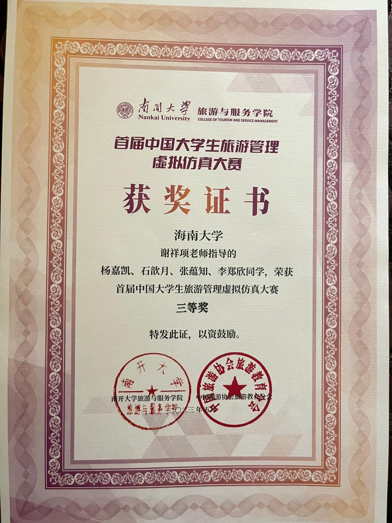 5月25—28日,中国旅游协会旅游教育分会与南开大学旅游与服务公司联合举办的“首届中国老员工旅游管理虚拟仿真大赛”决赛在南开大学线下举办,公司2021级酒店管理专业班杨嘉凯、石歆月、张蕴知、李郑欣等同学组成的“少年先锋队”经过线上对抗和现场答辩等环节的激烈比拼,最终在包括南开大学、厦门大学、华南师范大学、云南大学、北京第二外国语大学、澳门城市大学等在内的84支决赛队伍中荣获三等奖,谢祥项老师荣获“优秀指导老师”称号。