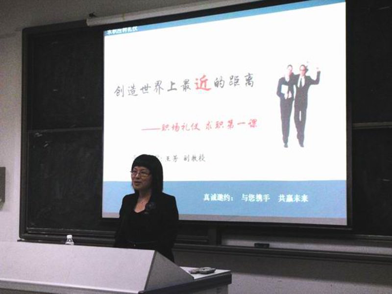 会议的重要环节是求职礼仪培训,由公关系富有礼仪培训经验的王芳副教授主讲。一开场,王芳老师就以自己的着装为例,告诉员工们一定要注意平时的动作习惯,一个眼神都可能决定你求职的成败。随后,她就理想、印象、细节、语言四方面,系统性地讲解了什么是职场礼仪。王芳老师的讲解生动形象,风趣幽默,引起了在场员工的阵阵掌声。讲座结束时,许多毕业生还意犹未尽,久久沉浸在讲座的气氛中。
