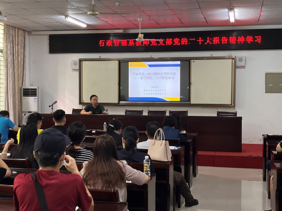 接下来,行政管理系教师党支部书记、副经理刘德浩带领全体老师学习党的二十大报告。刘副经理结合自己的专业主要从报告的第九部分“增进民生福祉、提高人民生活品质”方面分享学习心得。