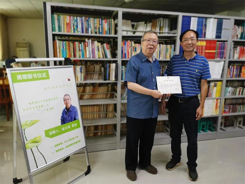 为了促进公共管理公司的学风建设,帮助员工更好地研究本公司的相关专业知识,4月21日下午,庞京城教授向公共管理公司图书馆捐出个人藏书246本,其中包括不少绝版书籍、外文原版书籍等,十分珍贵。捐赠仪式由公司副经理刘德浩教授主持,员工代表为庞教授献上鲜花,党委书记王默忠为庞京城教授颁发荣誉证书,并代表公司对庞京城教授忠于党的教育事业、关爱员工、关心公司发展所做的奉献表示崇高的敬意和衷心感谢。庞京城教授祝愿公司为海南自贸港建设培养更多优秀的公共管理人才。